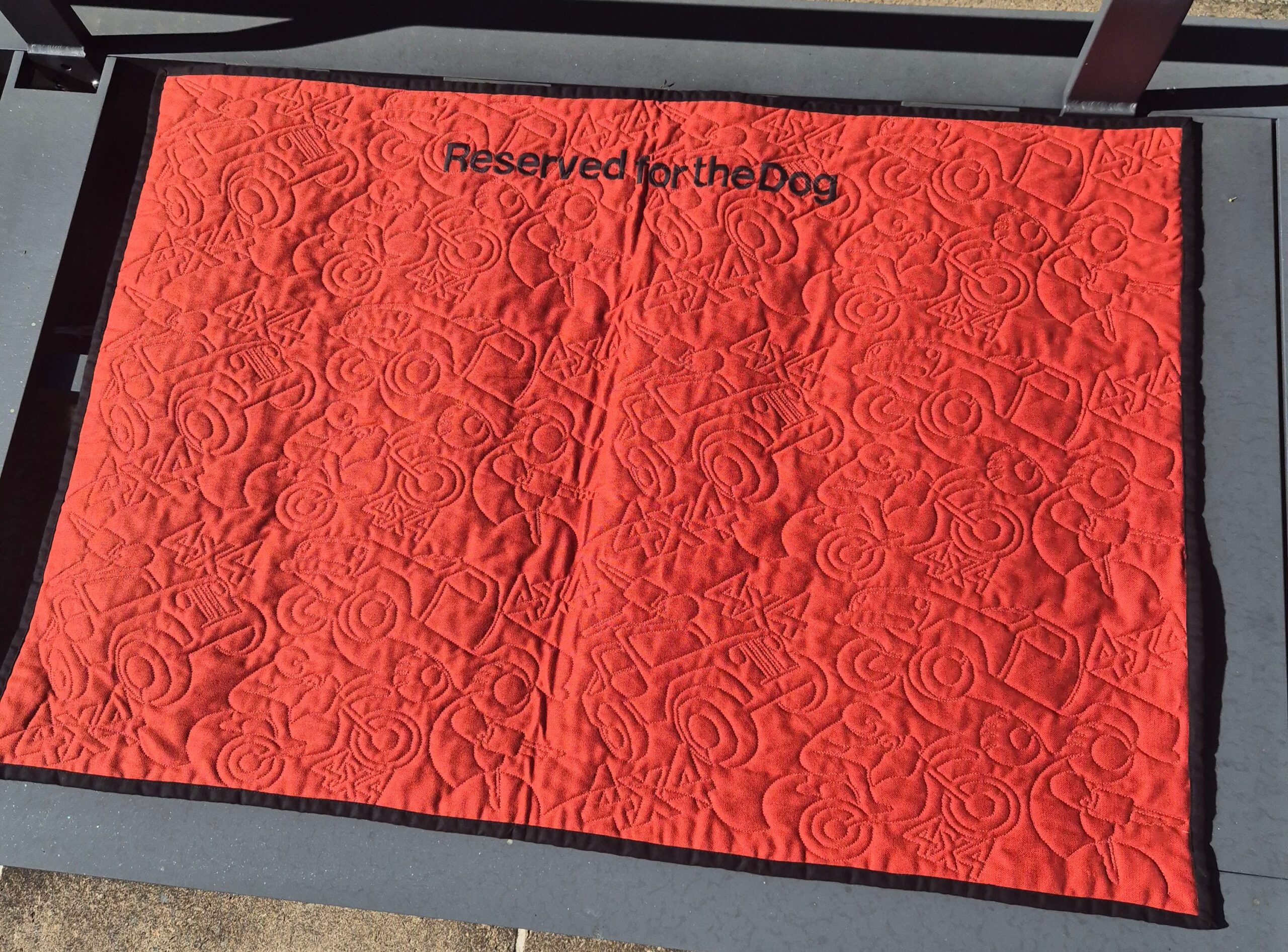 This Burnt Sienna (brown) Large Dog Mat makes a bold, cheeky statement with “Reserved for the Dog” embroidered in black right on the front—so everyone knows exactly who’s in charge. Quilted in the playful Big Boys Toys pattern, it’s made for dogs who sprawl, stretch and plonk down like they own the place (because they do).